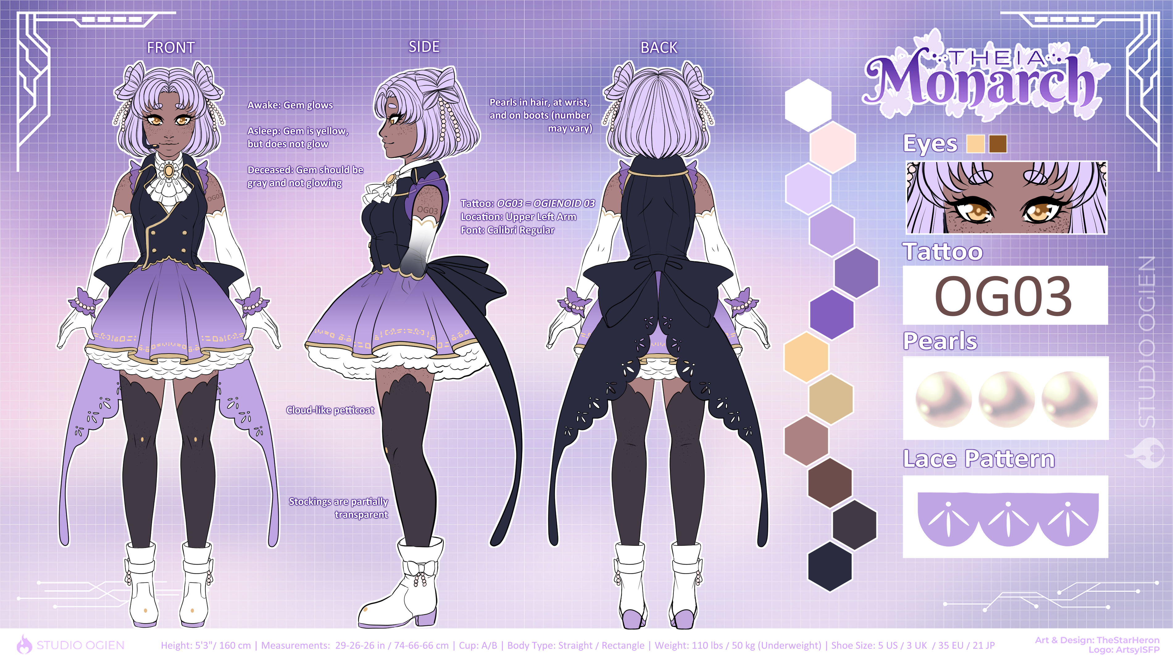 THEIA OG03 is the third member and second planned biodroid of the OGIENOID series. She was a custom-made model programmed for singing, dancing, and socializing. From the beginning, she was a natural-born idol, destined to be the center of any group.